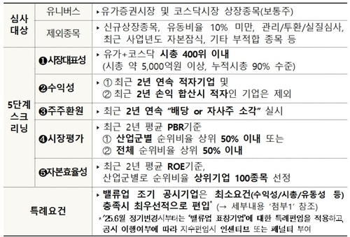한국거래소는 주가순자산비율(PBR), 자기자본이익률(ROE), 배당수익률 등을 종합적으로 고려하여 100개 종목을 선정하였다고 밝혔습니다. 한국거래소는 K밸류업 프로젝트의 의미에 맞게 상대 평가를 통해 산업군 별로 다양한 기업을 이번 명단에 선정하였습니다. 이에 따라 삼성전자 SK 하이닉스 같은 대기업을 비롯하여 엔터테인먼트 회사인 JYP,에스엠과 온라인 방송 플랫폼 SOOP 등 다양한 종목이 골고루 선정되었다는 평가 입니다.