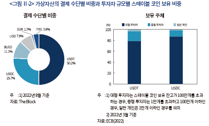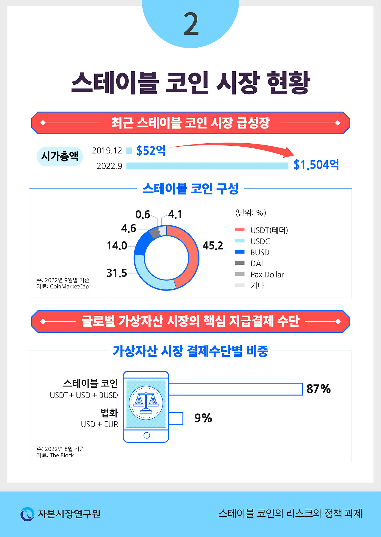 스테이블 코인의 시장은 최근 몇 년 동안 급격히 성장했습니다. 2019년 12월에는 시장 자본이 5200만 달러에 불과했으나, 2022년 9월에는 15억 달러로 증가했습니다. 현재 스테이블 코인은 전 세계 자산 시장 결제 방법의 87%를 차지하고 있으며, 이는 전통적인 통화인 USD와 EUR이 각각 9%를 차지하는 것과 대조적입니다.