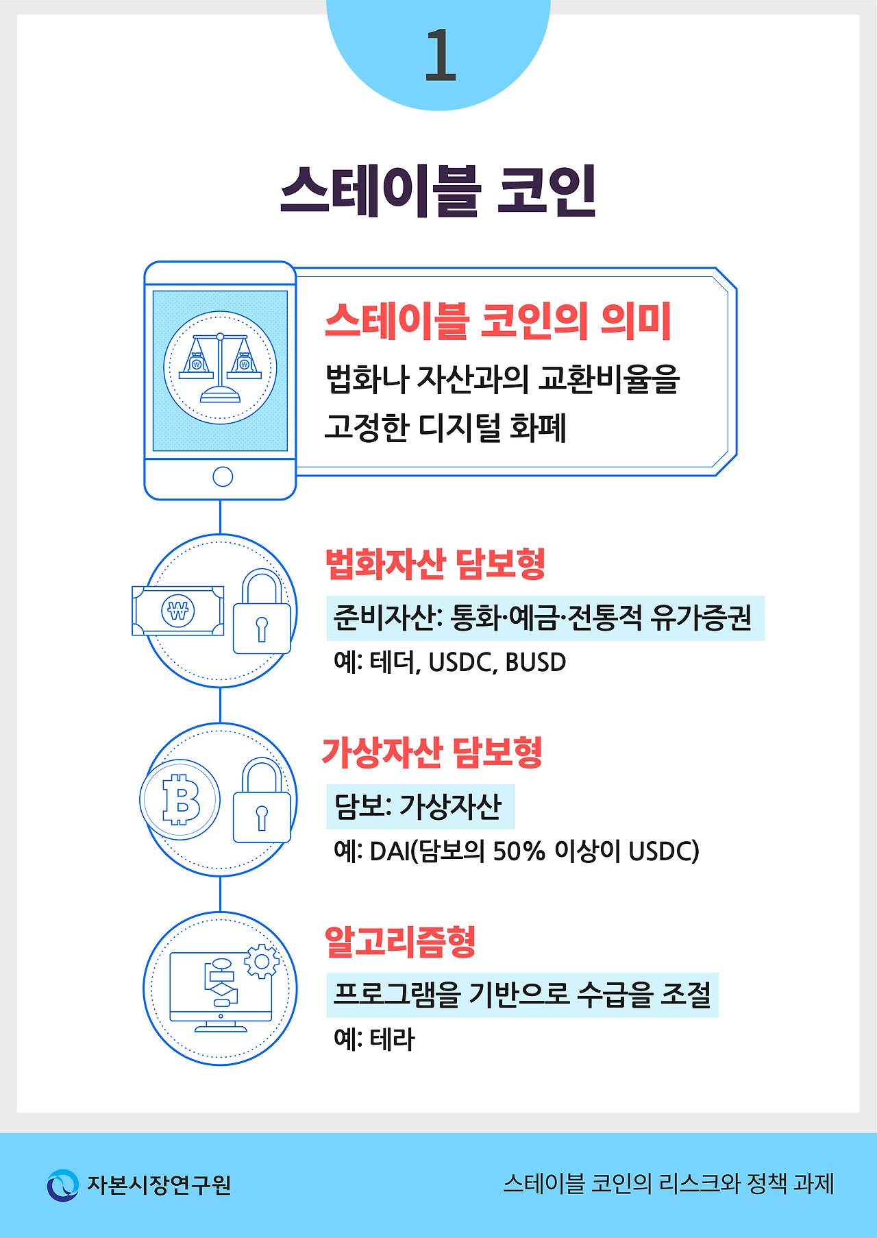 - 마지막으로 알고리즘 스테이블 코인은 프로그래밍된 알고리즘에 따라 공급을 조정하여 가치를 유지하는 방식입니다. 예를 들어, Terra가 이에 해당합니다.