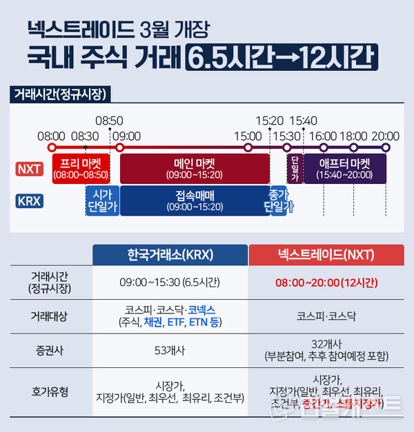 기존 한국거래소(KRX)의 거래 시간은 오전 9시부터 오후 3시 30분까지로, 하루 6.5시간에 불과합니다. 반면, 넥스트레이드는 하루 12시간으로 운영되며, 프리마켓과 애프터마켓을 통해 추가적인 거래 기회를 제공합니다.